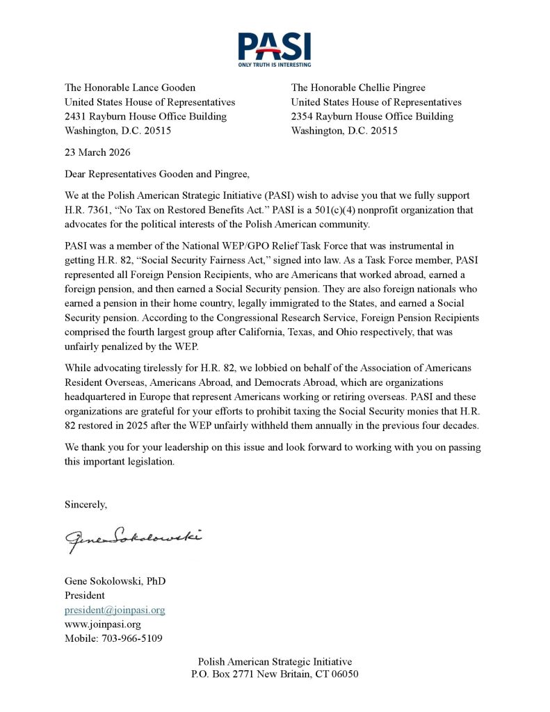 List organizacji PASI stanowi oficjalne poparcie dla projektu ustawy H.R. 7361 („No Tax on Restored Benefits Act”), który ma na celu zniesienie opodatkowania przywróconych świadczeń Social Security dla osób dotkniętych wcześniejszymi regulacjami (WEP).